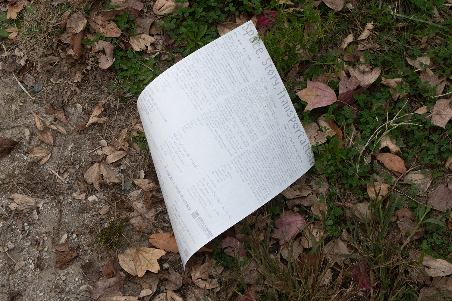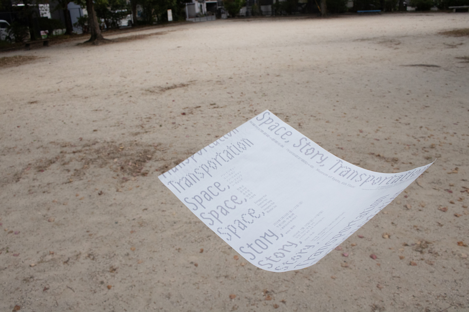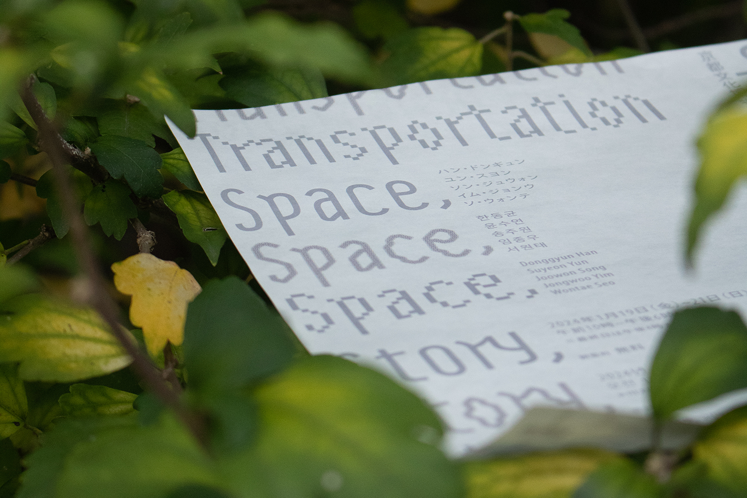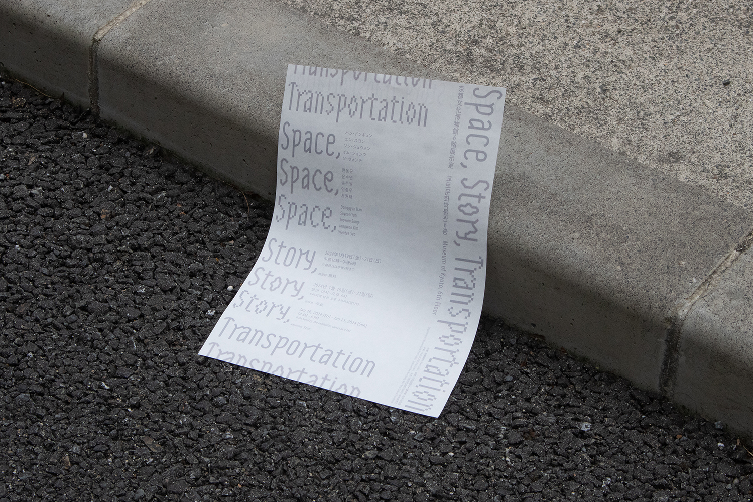 京都文化博物館で開催された「Space,Story,Transportation展」の広報デザインを担当。「場所、物語、そして移動」を軸に韓国の現代アーティスト5名の作品を紹介する展示にふさわしいビジュアル作りを目指し、タイトルである「Space,Story,Transportation」そのものを表現することを試みた。「生まれた情報は、その場所に留まることなく、いつしか物語になり移動を始める」という広報のあり方と「タイトル」を掛け合わせたコンセプトを立ち上げ、そこから情報が伝達する過程で、速度を上げ広がるのに対し、情報の密度は薄くなっていくと定義し、情報の伝達の歴史もまた、密度に関係すると展開し、描く、印刷、デジタルメディアの表現の違いを文字造形で表現した。情報が「得る」からいつしか「見る」へ変わってしまった世の中に対するアンチテーゼも込めて。